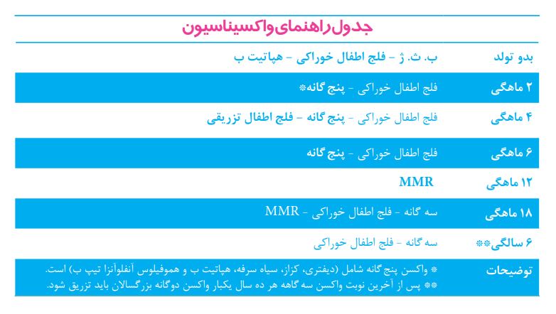 هیچ راه دیگری به جز واکسیناسیون برای پیشگیری از بیماری های شایع زیر وجود ندارد. باید مطابق با برنامه اصلی ایمن سازی کشور، همه کودکان واکسن دریافت کنند. برنامه واکسیناسیون کشور ما طبق جدول زیر است و ممکن است تغییراتی کند که معمولا ازطریق مراکز بهداشتی درمانی اجرا خواهد شد. ضروری است برای ایجاد مصونیت لازم انجام واکسیناسیون در تاریخ های مقرر و سروقت انجام شود و از تعجیل و یا تأخیر پرهیز گردد.